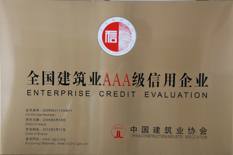 2009年5月26日集团公司被评为全国建筑业AAA级信用企业,此奖项是经商务部、国资委和中国建筑业协会共同颁发的建筑业信用管理最高奖。