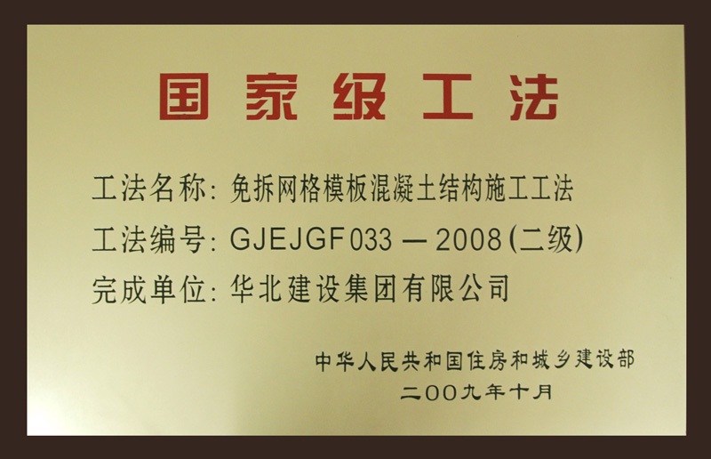 2009年10月19日,华北建设集团成功向国家建设部申报两项国家级工法并通过公示,分别是免拆网络模板混凝土结构施工工法和点式玻璃幕墙施工工法。